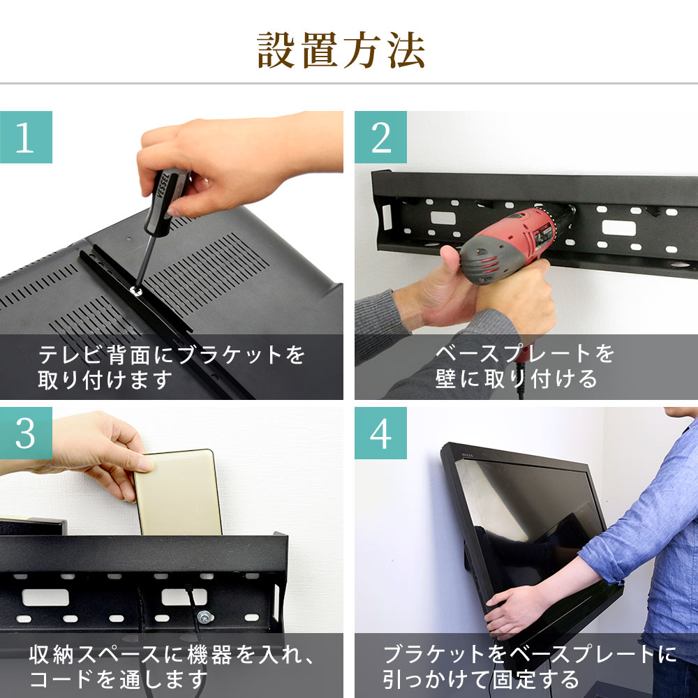 テレビの設置条件と異なる設置による事故・故障等の保証はございませんので、施工前にテレビ、及び商品の説明書をよくご確認ください。