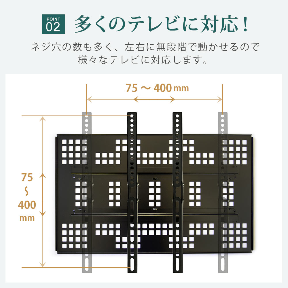 ・テレビ背面にネジ穴があいている事 ・テレビ背面がフラットである事 ・テレビサイズが37~47インチである事 ・テレビ重量が20kg以下である事 ・テレビ背面のネジ穴の間隔が「縦:75~400mm 横:75~400mm」である事 |