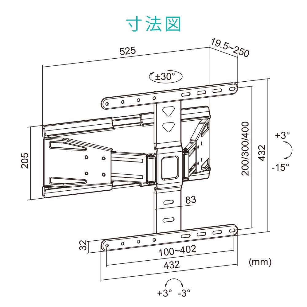 | 上+3度、下-15度、左右±30度(壁に当たるまで) 、水平調節±3度 |